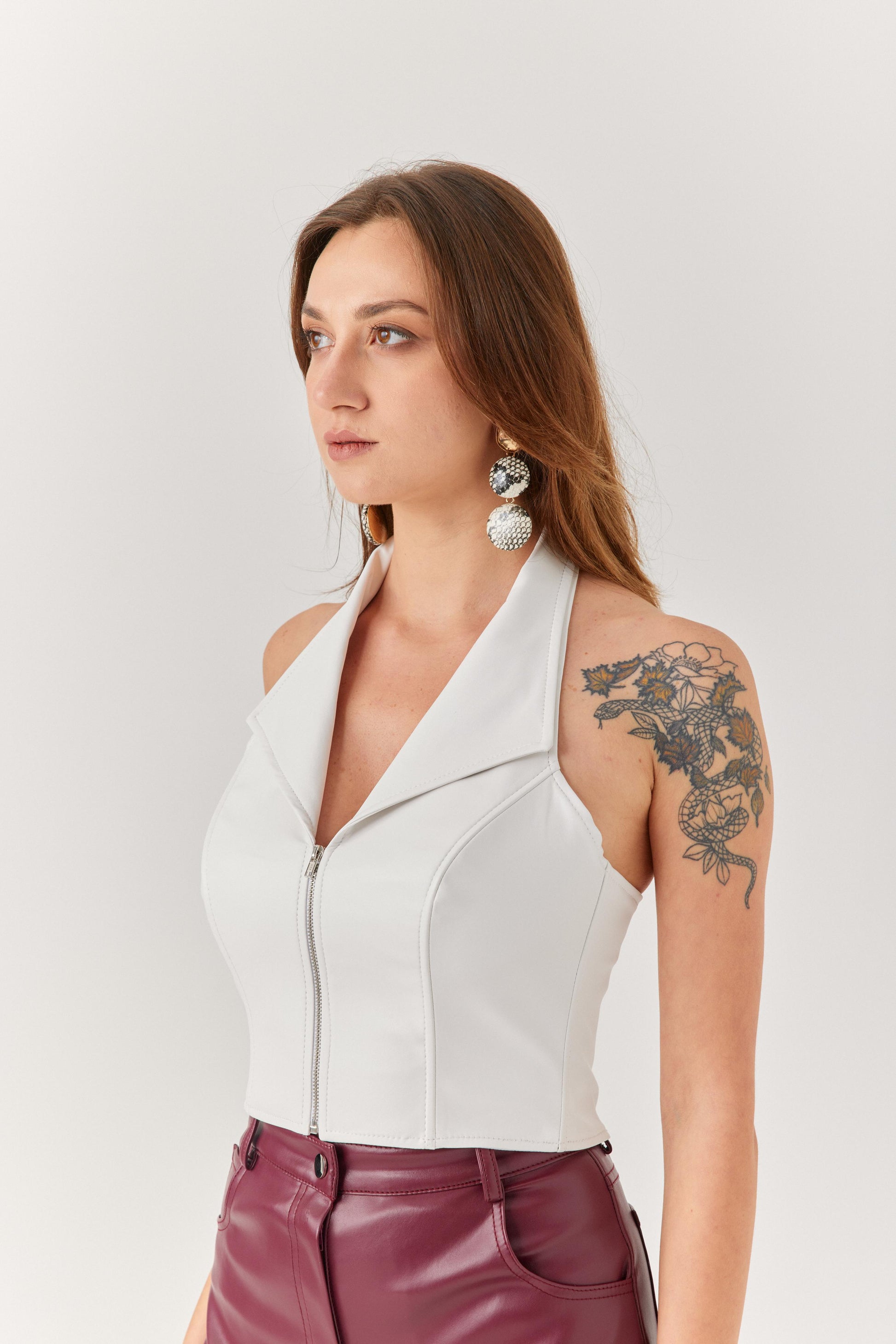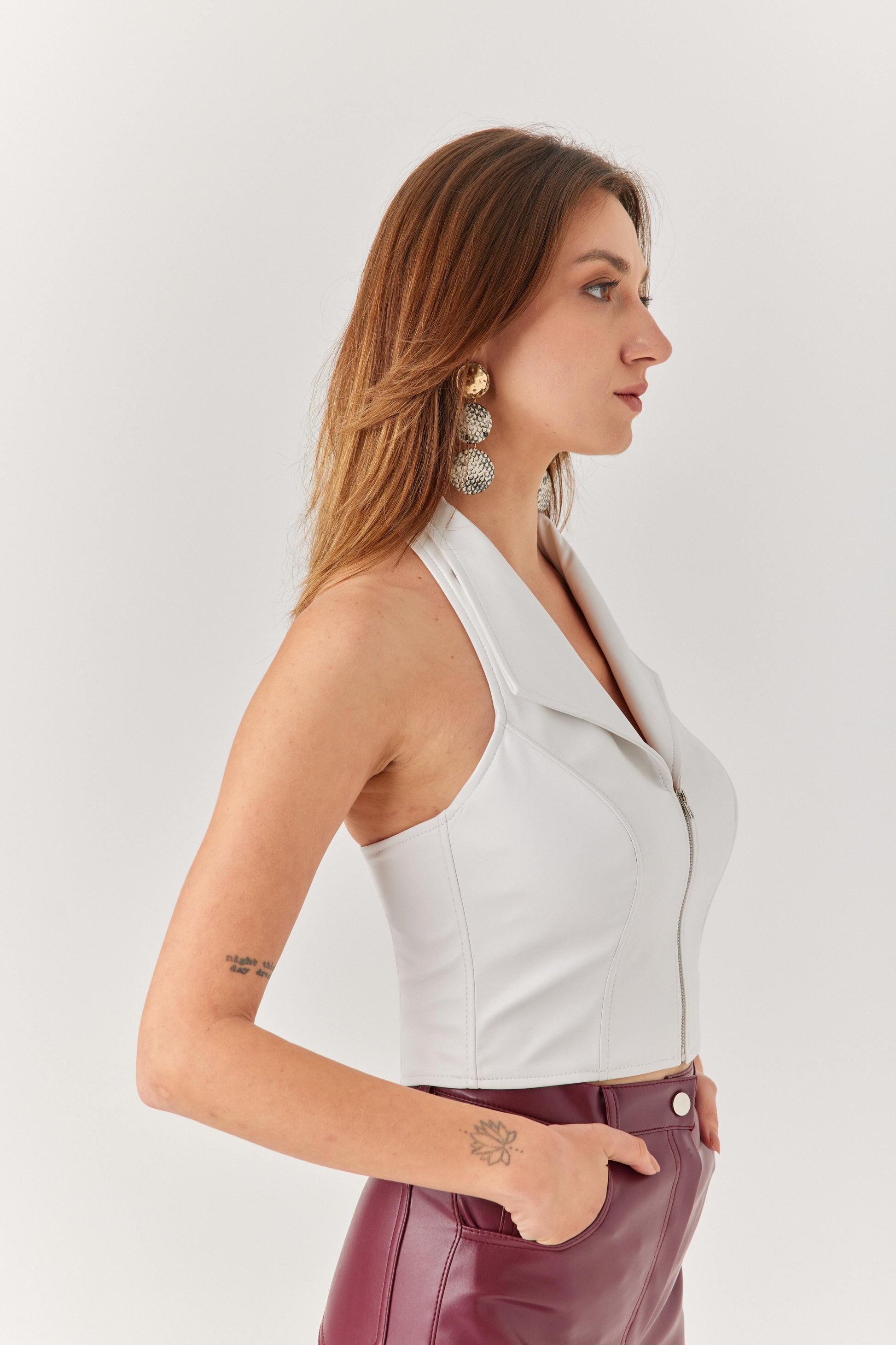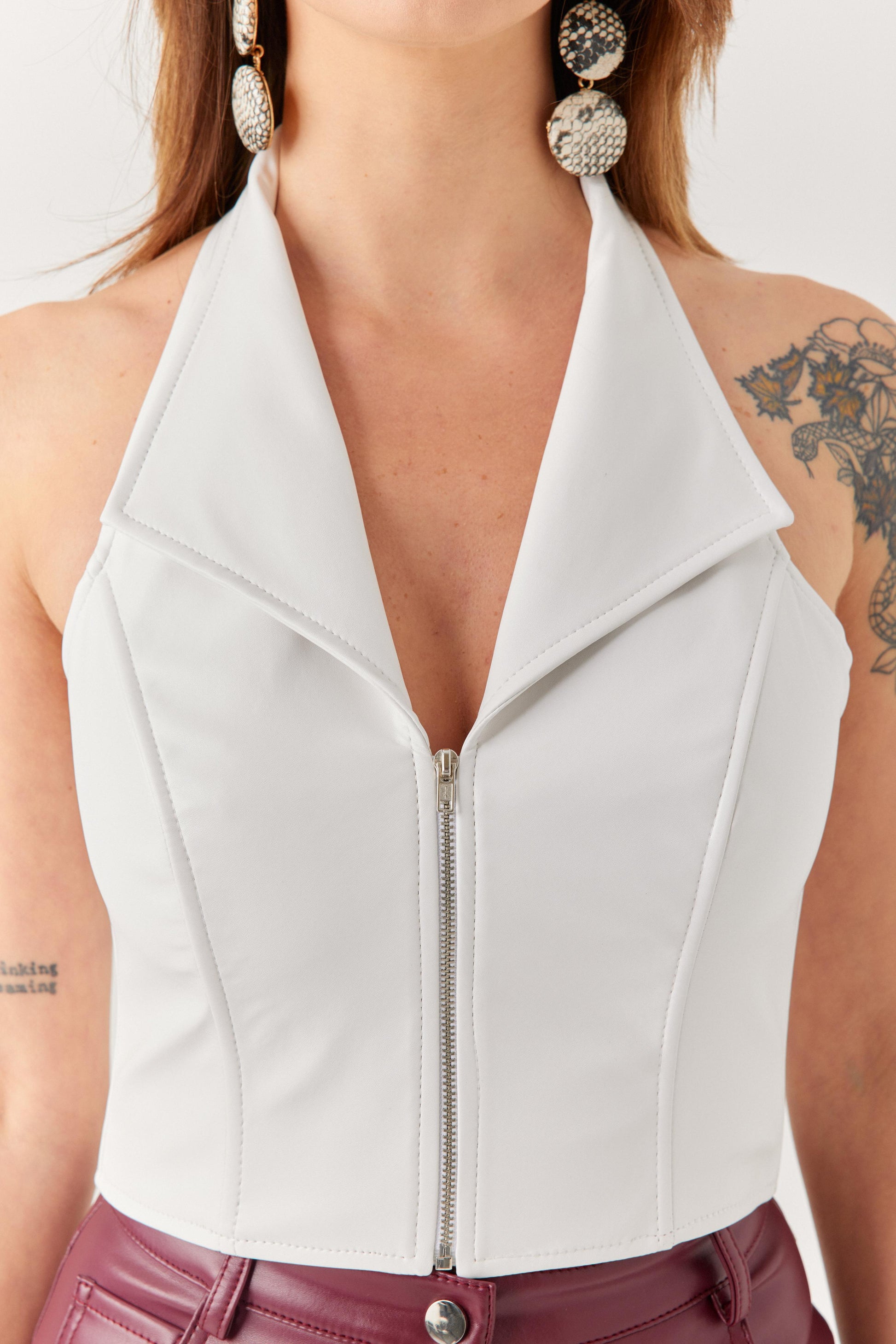 Beyaz Kalın Askılı Göğüs Dekolteli Bluz
