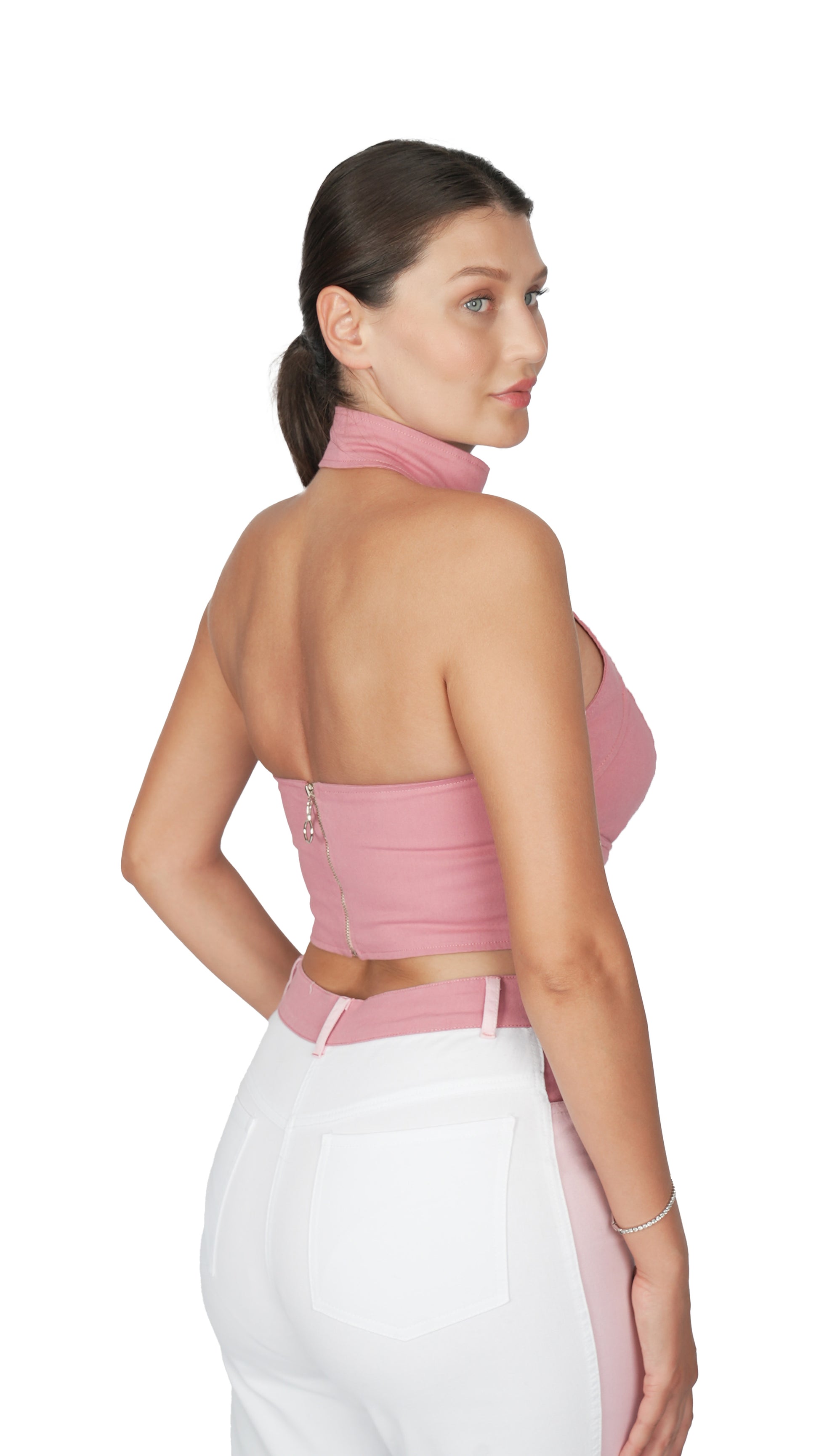 Pembe Beyaz Parçalı Üç Renk Yüksek Bel Kot Pantolon